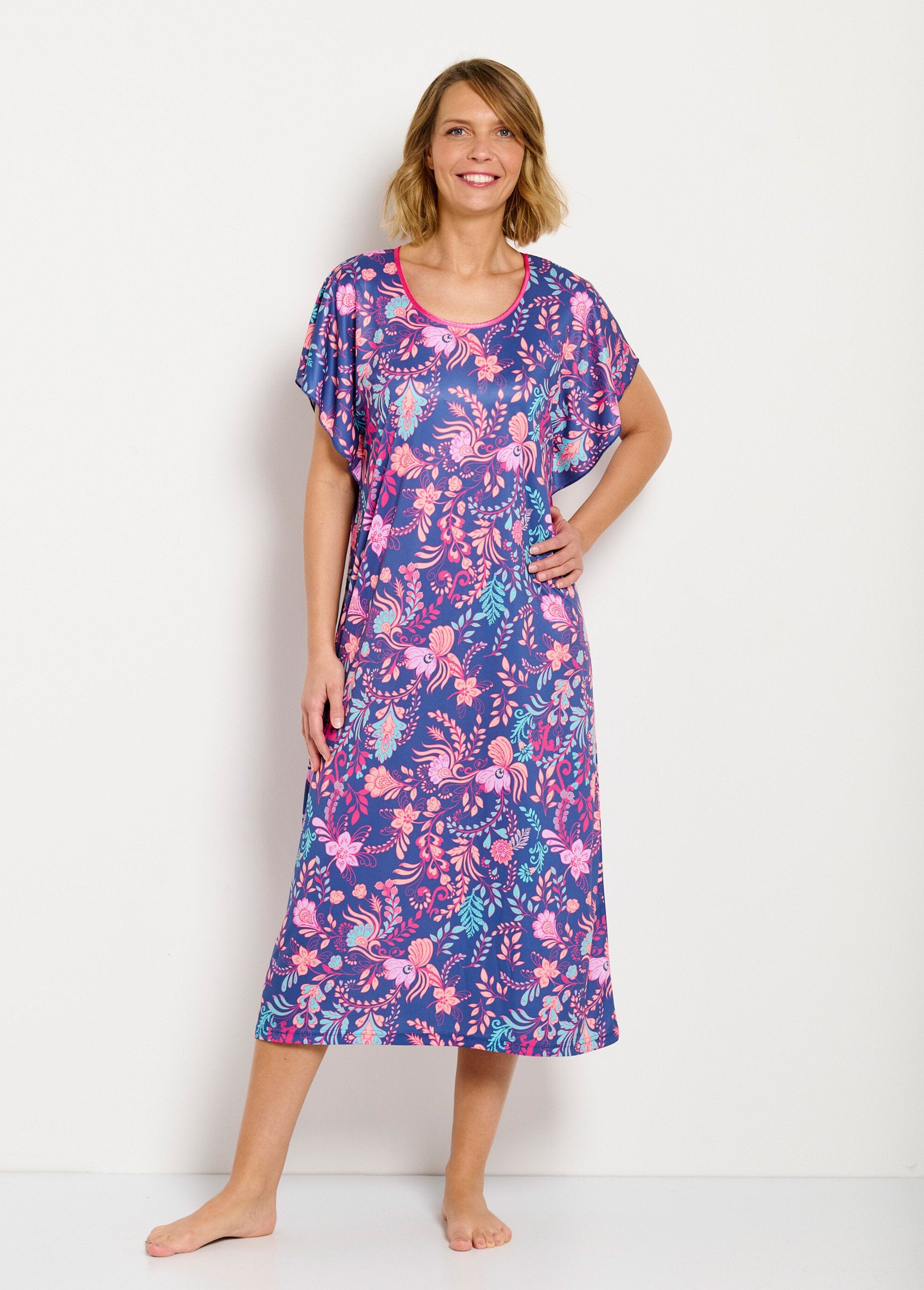 Harmonious floral print, long and loose fit... The hostess dress accompanies you every day with all femininity. Beautiful fullness of the bias-finished butterfly sleeves. Round neckline with contrasting bias. Straight hem.