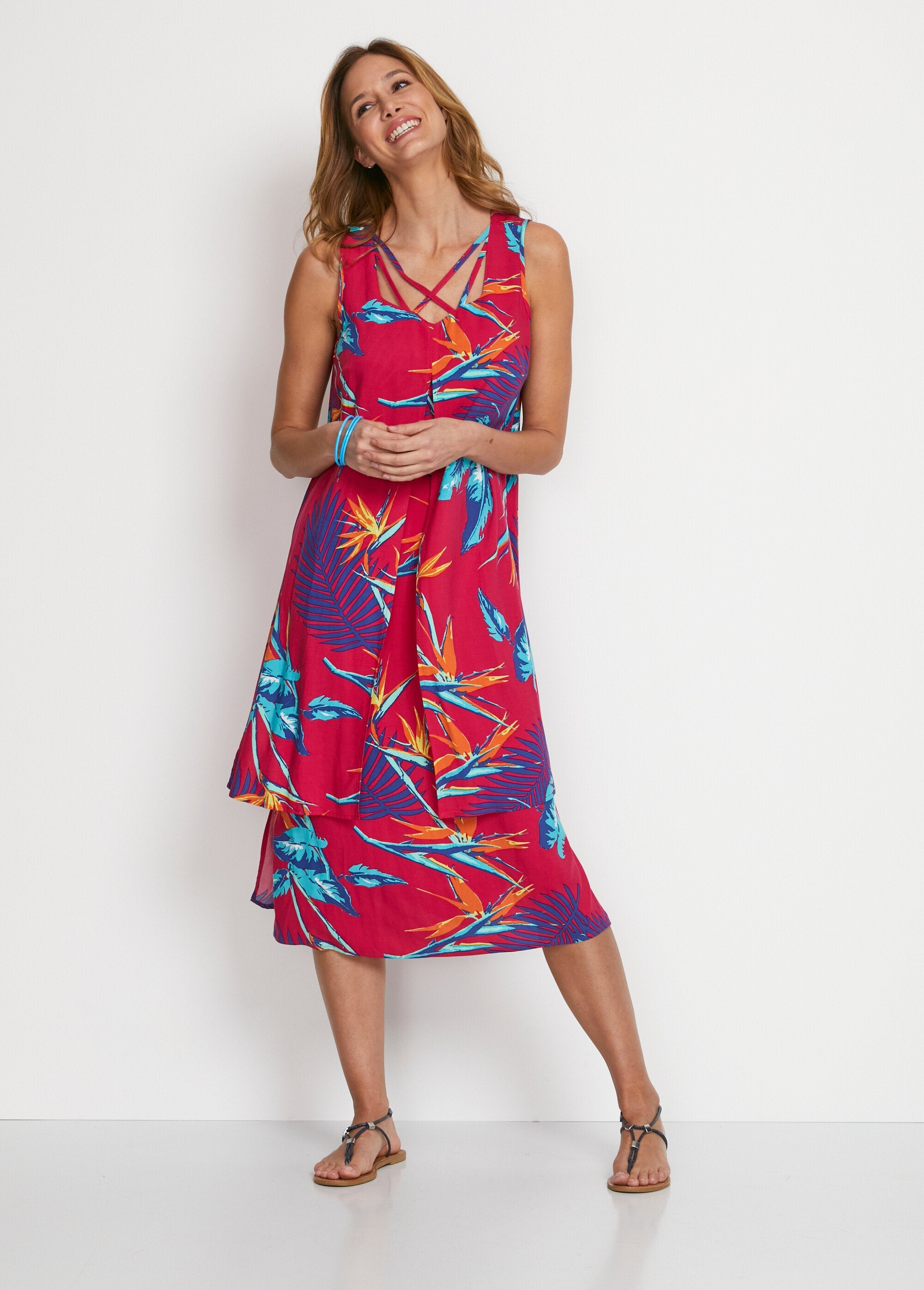 Sleeveless mid-length dress with plant pattern  Raspberry background