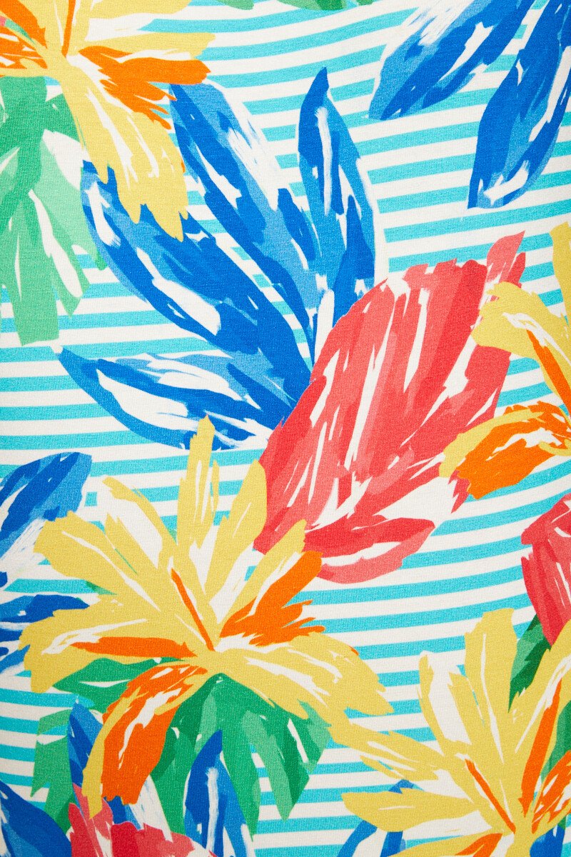 Imprimé flatteur et réalisation soignée pour le tee-shirt facile à vivre. Biais uni rapporté à l'encolure arrondie et à la fantaisie goutte d'eau devant. Double piqûre à la base et au bas des manches courtes kimono. Fabrication française.